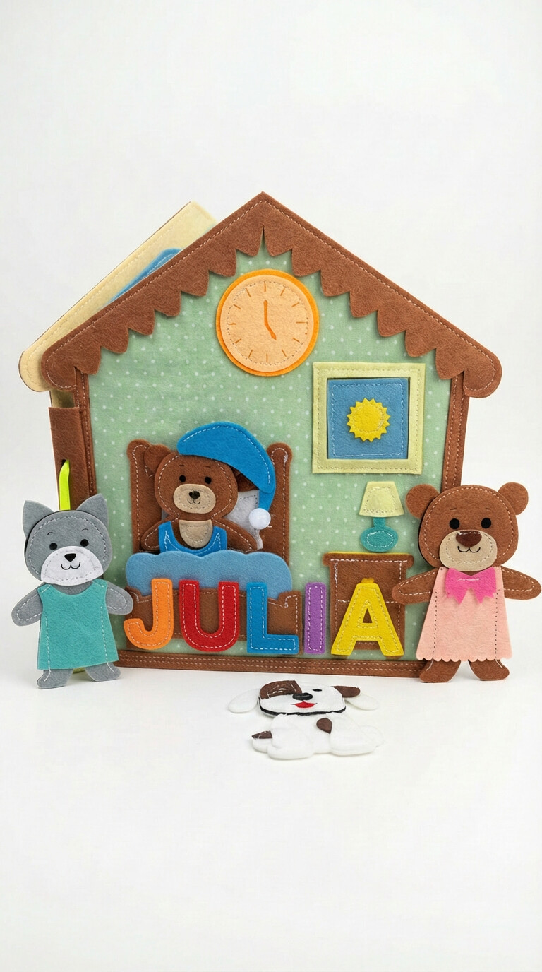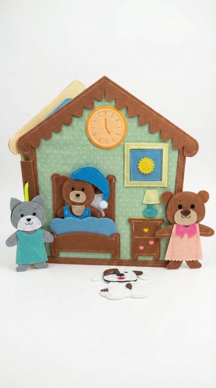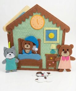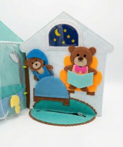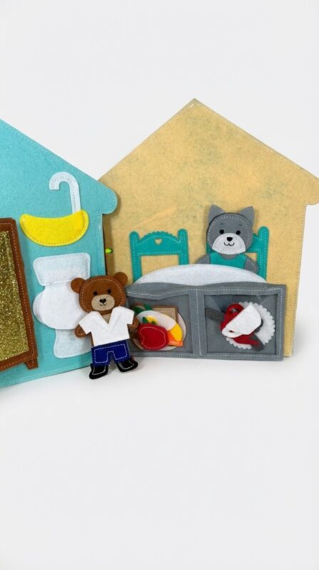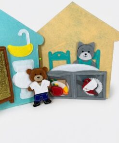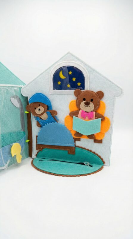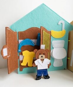 A kézzel készített, puha és teljesen biztonságos csendeskönyv a mackó egy napjának jeleneteit mutatja be: ébredés, öltözködés, étkezés, játék, fürdés és alvás.