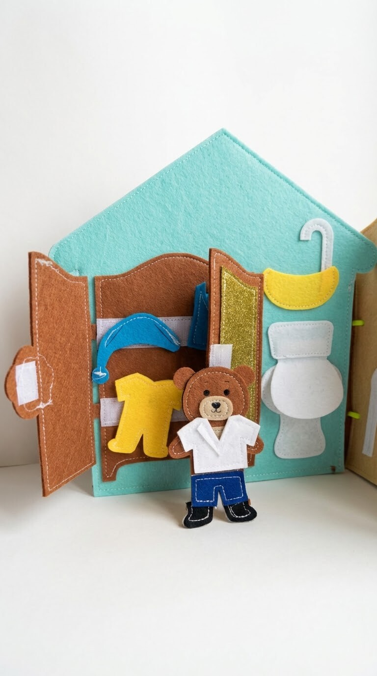 A mackó a szekrény előtt áll. A gyermek kinyitja az ajtót, és megkeresi a ruhákat – póló, nadrág, pizsama, sapka. Kiválaszthatja, mit vegyen fel ma a mackó. A tevékenység segíti a ruhadarabok felismerését, a rendszerezést és az öltözködési rutin megértését.