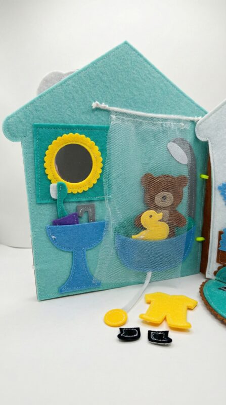 A gyermek segít a mackónak a fürdőszobában – a kádban egy kiskacsa várja. A hálós zuhanyfüggöny szenzoros élményt nyújt (a háló tapintása). Bátorítsuk:
