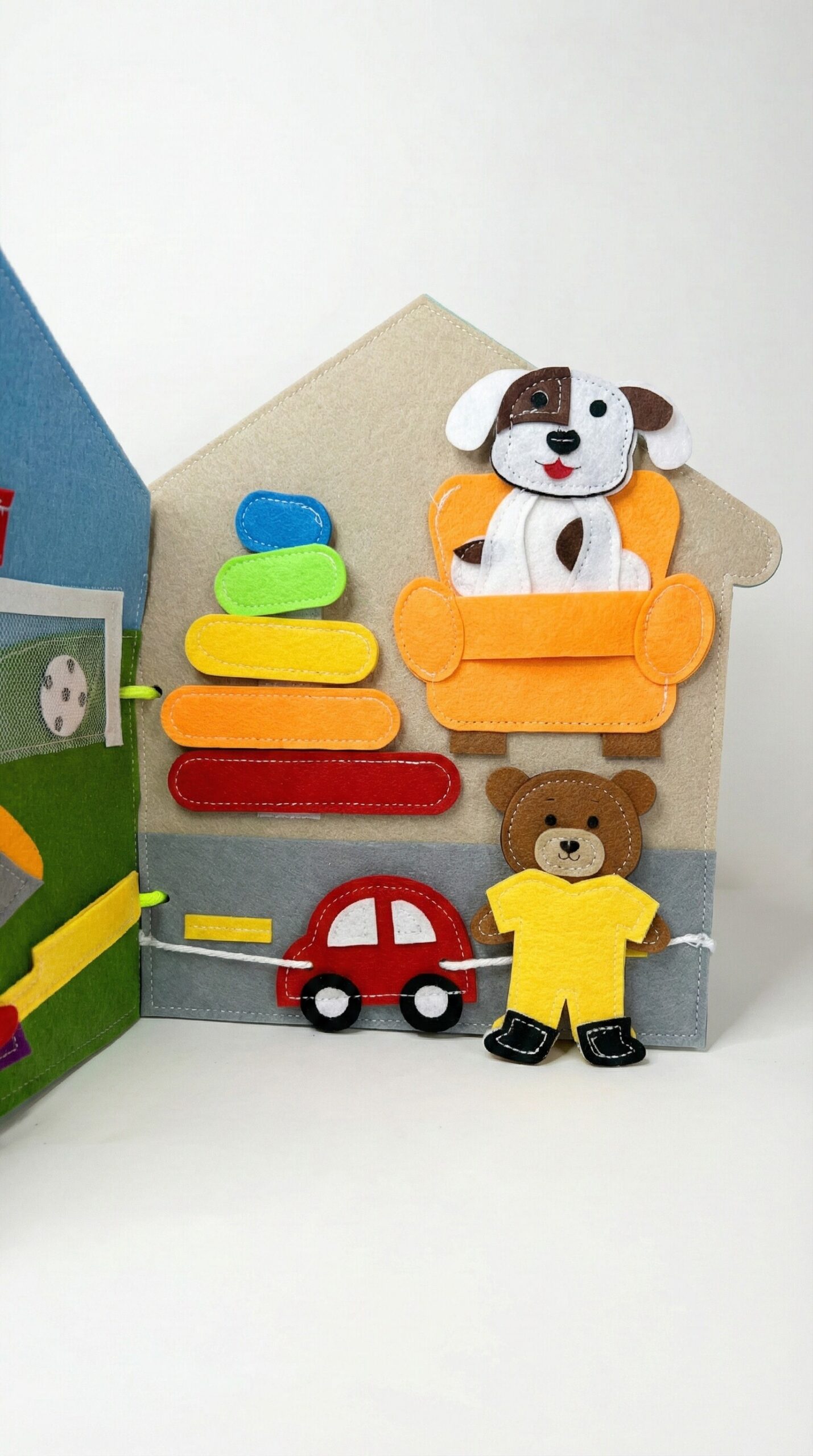 A házikó otthonos terében a gyermek színes toronyelemeket rakosgat, autóval vezeti a mackót az úton, vagy a kutyus mellé ülteti a kanapéra. Ösztönözzük a színek és tárgyak megnevezésére, valamint a szimbolikus játékra – ki vezeti az autót, ki ül a kanapén, ki építi a tornyot?