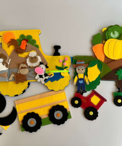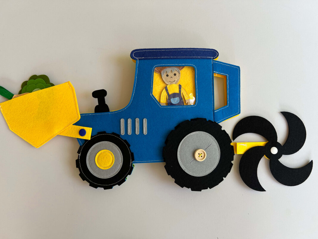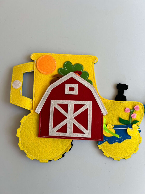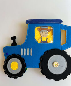 A Traktor könyv játékosan vezeti be a gyermeket a mezőgazdasági világba: megtanul betakarítani, traktort vezetni, felismerni a szerszámokat és gondoskodni az állatokról. Mindezt játék közben – amikor húz, tol, illeszt, beilleszt vagy mozgat egy-egy elemet –, fejlődnek az alapvető kézügyességi készségek.