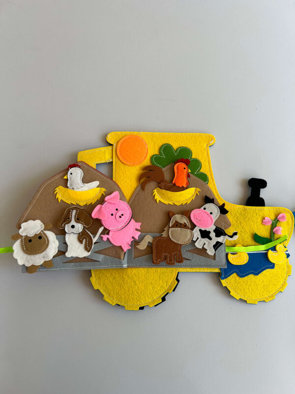 Út közben a traktor különféle állatokkal találkozik – tehénnel, báránnyal, tyúkkal. A gyermek megnevezi őket, megtanulja, hol élnek és mit esznek.