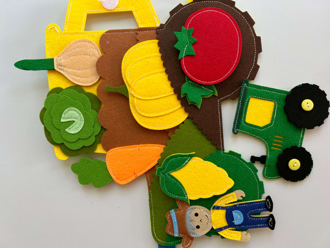 A mezőkön megérett a kukorica, krumpli és alma. A gyermek betakarítja őket, és a traktor utánfutójára rakja. Vajon ma piacra viszünk zöldséget vagy szénát a pajtába? Nézd meg, mi érett meg!