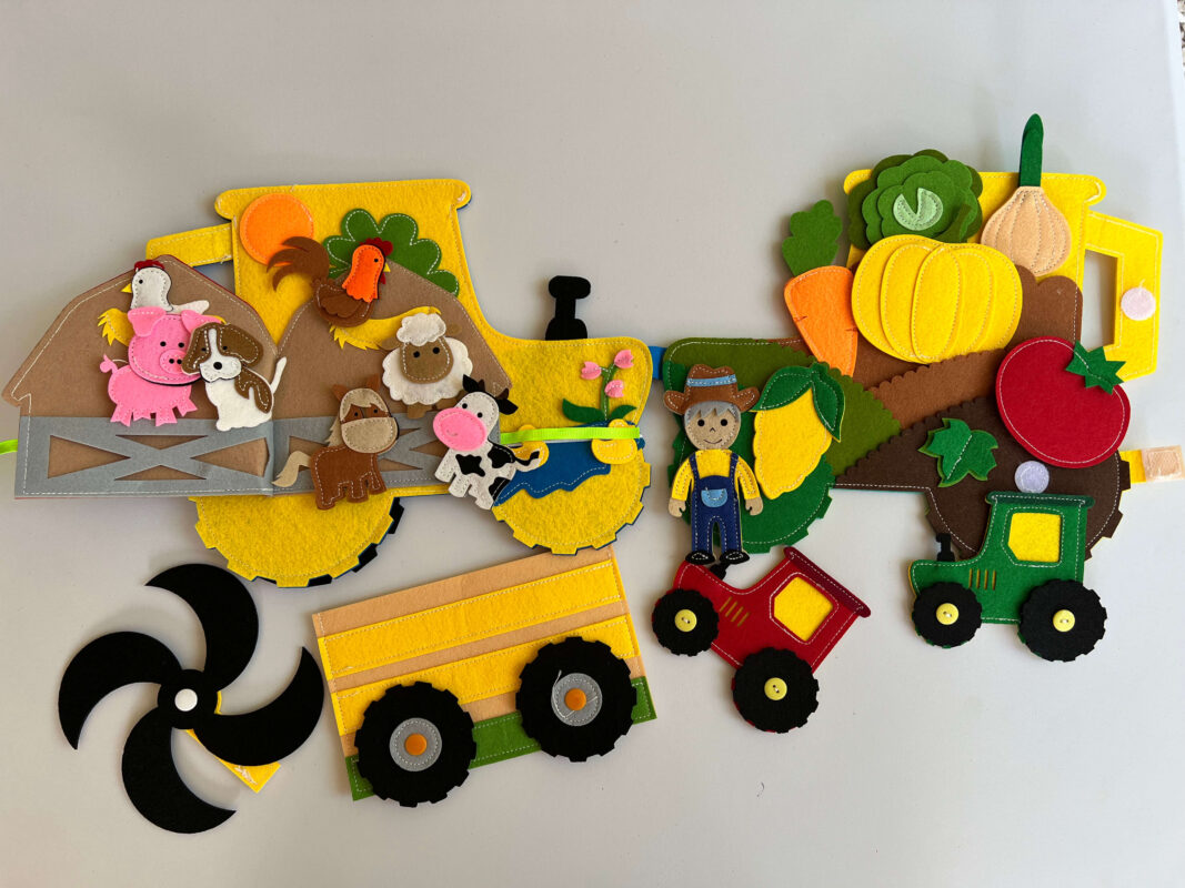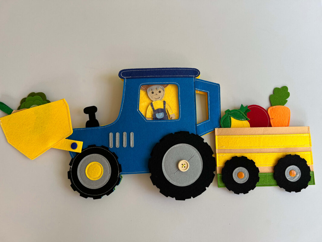 A traktor utánfutót húz, amelybe különféle rakomány kerülhet – széna, zöldség vagy épp egy titokzatos láda. A pakolás és szállítás fejleszti a finommotorikát és serkenti a képzelőerőt.